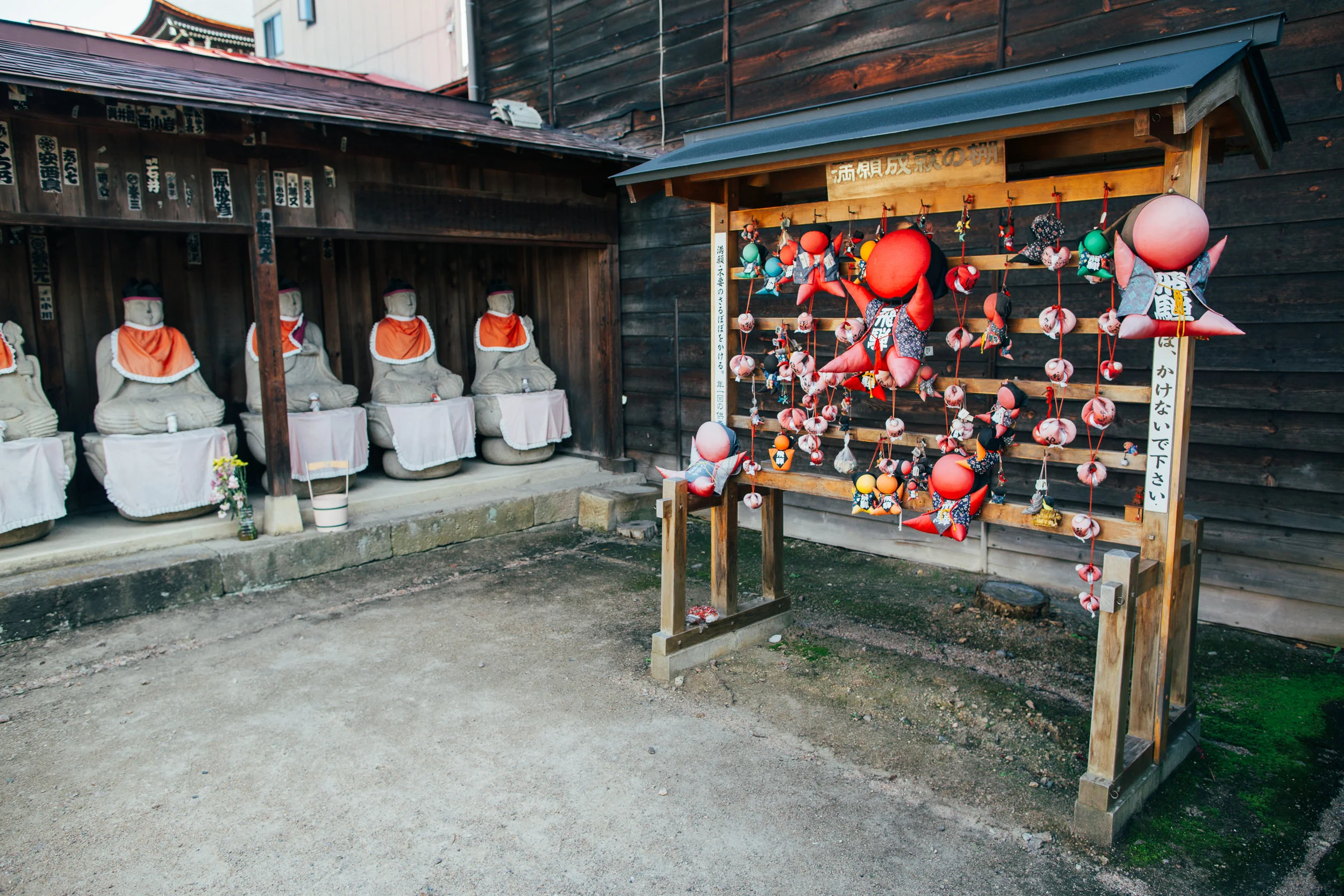 The red dolls you see on the right side of the photo are known as Sarubobo and are associated with Takayama. They are dolls given to grandchildren by grandmothers wishing them successful marriages and healthy offspring. Over the years, the Sarubobo doll has been 'modernized' with different colours representing different wishes (studies, career, health, money, etc.). That said, the red one is still the prevailing colour you will see in most gift shops, shrines and tourism centres.